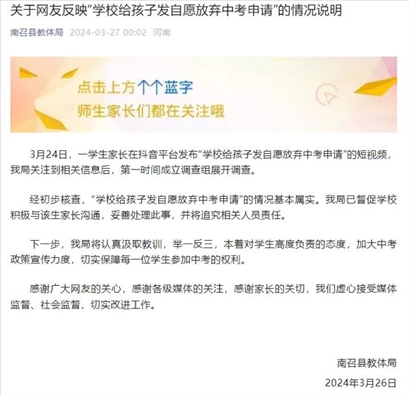 ·網(wǎng)傳河南一學(xué)校勸學(xué)生自愿放棄中考,縣教體局:基本屬實(shí),將追責(zé)。
