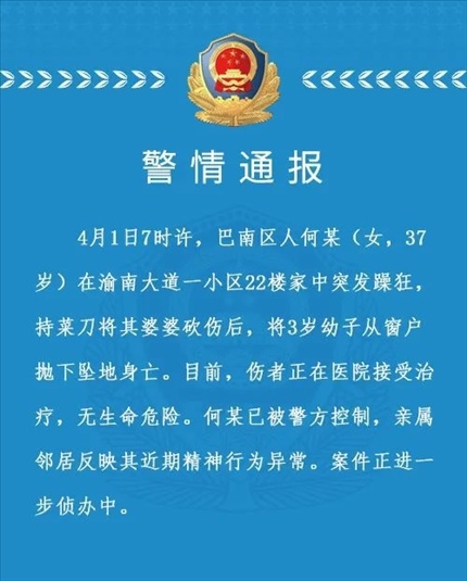 ·重慶一女子砍傷婆婆后將3歲幼子拋下樓致死,已被警方控制。鄰居稱(chēng)女子高空拋?zhàn)忧岸啻胃呖諕佄?,知情人稱(chēng)扔小孩母親避開(kāi)了安全氣囊。