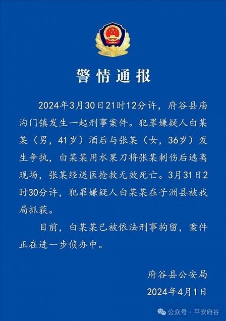 ·陜西府谷警方通報(bào)“男子將女子刺傷致死”:嫌犯已被刑拘。