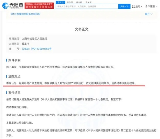 ·近日,演員鄭爽與海寧東開(kāi)之星影視投資有限公司合同糾紛案件新增執(zhí)行裁定書(shū)。經(jīng)窮盡財(cái)產(chǎn)調(diào)查措施,法院認(rèn)定鄭爽無(wú)財(cái)產(chǎn)可供執(zhí)行。