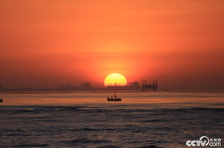 近日,山東省日照市,一輪紅日從海平面緩緩升起,遠(yuǎn)處的遠(yuǎn)洋巨輪、早起捕魚(yú)的漁船與紅日相互映襯,構(gòu)成了一幅唯美的春天海上日出畫(huà)卷。?