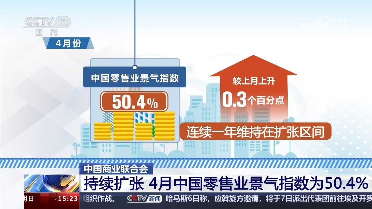 央視網(wǎng)消息:中國(guó)商業(yè)聯(lián)合會(huì)最新發(fā)布的中國(guó)零售業(yè)景氣指數(shù)顯示,4月份,中國(guó)零售業(yè)景氣指數(shù)為50.4%,連續(xù)一年維持在擴(kuò)張區(qū)間。全國(guó)商品經(jīng)營(yíng)類企業(yè)對(duì)4月份盈利增長(zhǎng)恢復(fù)的預(yù)期開始好轉(zhuǎn)。