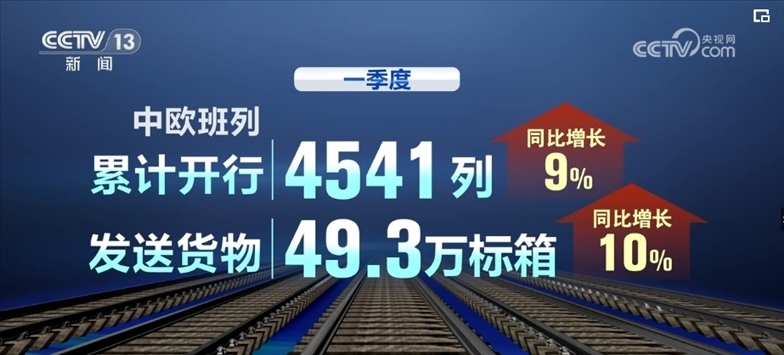 數(shù)據(jù)顯示,一季度中,歐班列累計(jì)開行4541列,發(fā)送貨物49.3萬標(biāo)箱,同比分別增長9%、10%。