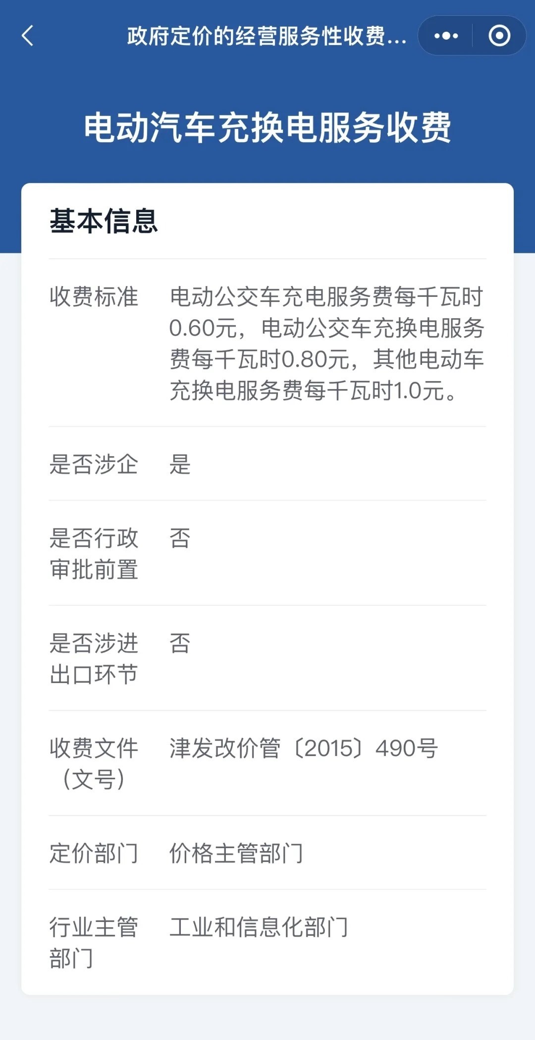 點(diǎn)擊定價(jià)項(xiàng)目名稱,就會(huì)看到具體的收費(fèi)標(biāo)準(zhǔn)、收費(fèi)文件、定價(jià)部門、行業(yè)主管部門、是否涉企等多項(xiàng)信息。