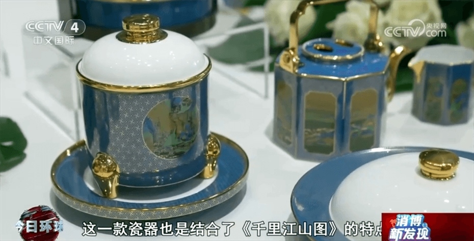 江西省景德鎮(zhèn)市商務(wù)局工作人員章少聰介紹稱:“這一幅畫是北宋王希孟先生創(chuàng)作的,叫作《千里江山圖》。這一款瓷器也是結(jié)合了《千里江山圖》的特點,把中國傳統(tǒng)畫中的山水、花鳥都完全在瓷器上面展現(xiàn)出來?!?/p>