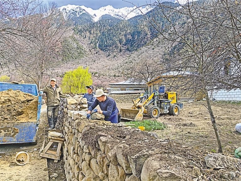 漫步村落,遠遠就聽見喧鬧聊天和砌墻的聲音,原來是強巴一家正在給果園砌圍墻?!霸豪锏奶O果樹發(fā)芽了,為了防止牛吃,我們就用石頭將圍墻壘得高一些,杜絕一切影響蘋果收成的因素?!睆姲退实匦Φ溃叭ツ晡覀兗屹u蘋果共收入4萬元,一年之計在于春,現(xiàn)在就要做足準備,今年收成肯定會更好!”閑談間,強巴從家里拿出一籃自家產(chǎn)的蘋果分給大家吃,深紅的蘋果在陽光下閃耀著誘人的光澤,散發(fā)著春天的甜美氣息。