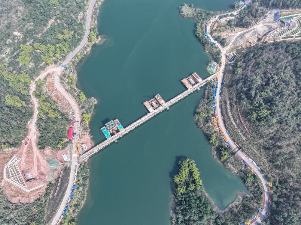 這是2月19日拍攝的位于重慶市銅梁區(qū)的成渝中線高鐵玄天湖大橋建設(shè)現(xiàn)場(無人機(jī)照片)。新華社記者 唐奕 攝