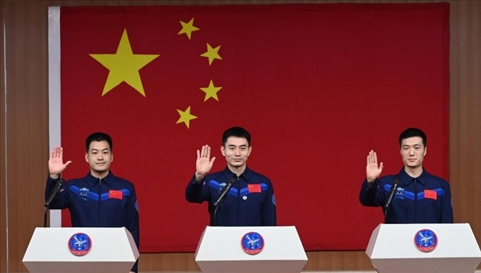 神舟十八號瞄準(zhǔn)4月25日20時59分發(fā)射,航天員葉光富(中)、李聰(右)、李廣蘇在酒泉衛(wèi)星發(fā)射中心問天閣與媒體記者集體見面。