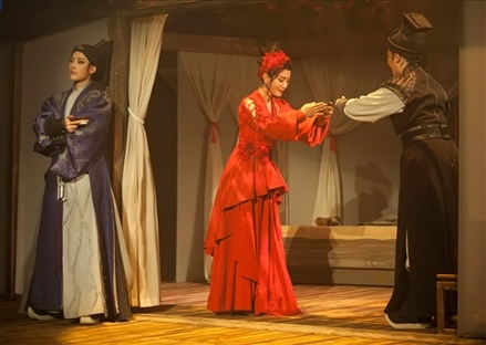 新國(guó)風(fēng)環(huán)境式越劇《新龍門客?!菲鸪踉诙桃曨l平臺(tái)走紅,熱度從線上傳導(dǎo)至線下,許多從未接觸過(guò)越劇的觀眾走入劇場(chǎng)。環(huán)境式劇場(chǎng)不同于傳統(tǒng)劇場(chǎng)的鏡框式舞臺(tái),舞臺(tái)不只是面前的一塊區(qū)域,而是實(shí)現(xiàn)了觀眾“身在其中”,濃厚的“氛圍感”撲面而來(lái)。