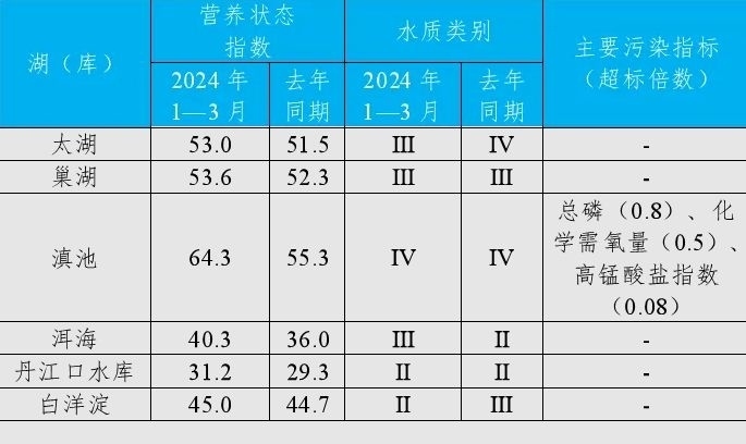 1—3月,監(jiān)測的201個重點湖(庫)中,水質優(yōu)良(Ⅰ—Ⅲ類)湖庫個數(shù)占比82.1%,同比上升1.1個百分點;劣Ⅴ類水質湖庫個數(shù)占比4.5%,同比下降0.1個百分點。主要污染指標為總磷、化學需氧量和高錳酸鹽指數(shù)。181個監(jiān)測營養(yǎng)狀態(tài)的湖(庫)中,中度富營養(yǎng)的9個,占5.0%;輕度富營養(yǎng)的31個,占17.1%;其余湖(庫)為中營養(yǎng)或貧營養(yǎng)狀態(tài)。其中,太湖和巢湖水質均為良好、輕度富營養(yǎng);滇池為輕度污染、中度富營養(yǎng),主要污染指標為總磷、化學需氧量和高錳酸鹽指數(shù);洱海水質良好、中營養(yǎng);丹江口水庫和白洋淀水質均為優(yōu)、中營養(yǎng)。