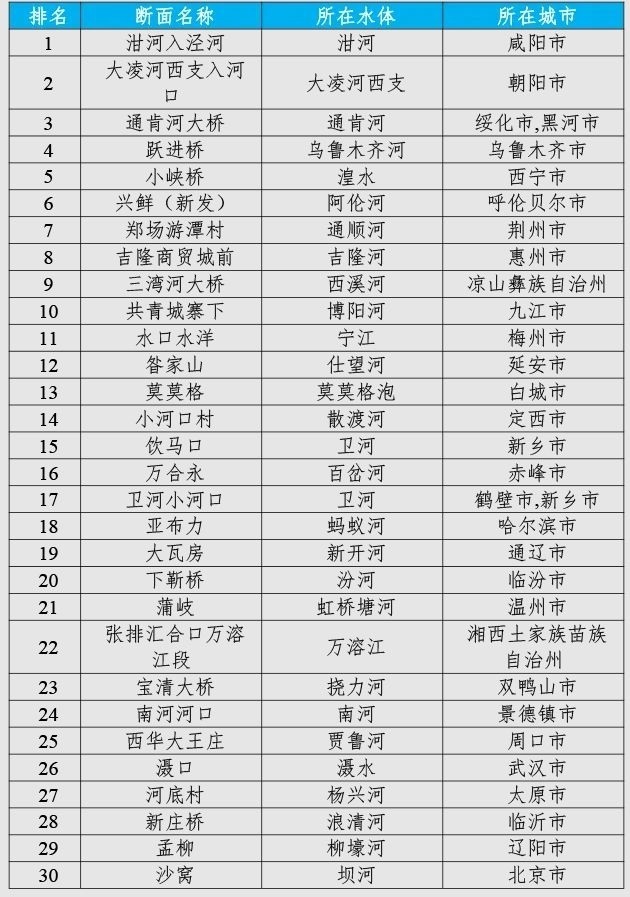 咸陽市泔河入涇河、朝陽市大凌河西支入河口和綏化市/黑河市通肯河大橋等30個國家地表水考核斷面水環(huán)境質量變化情況相對較好(從第1名至第30名),渭南市裕西、天津市新老米店閘和玉溪市化念水庫等30個國家地表水考核斷面水環(huán)境質量變化情況相對較差(從倒數(shù)第1名至倒數(shù)第30名)。