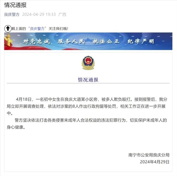 ·廣西南寧一中學發(fā)生欺凌事件,涉案8人被給予行政拘留等處罰。