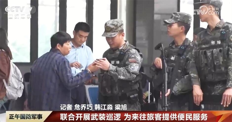 在安徽蚌埠火車站,武警官兵與公安特警聯(lián)合開展武裝巡邏,主動(dòng)加大對重點(diǎn)區(qū)域的實(shí)時(shí)監(jiān)控和巡邏力度,在維護(hù)秩序的同時(shí),官兵還耐心為廣大旅客答疑解惑,提供便民服務(wù)。