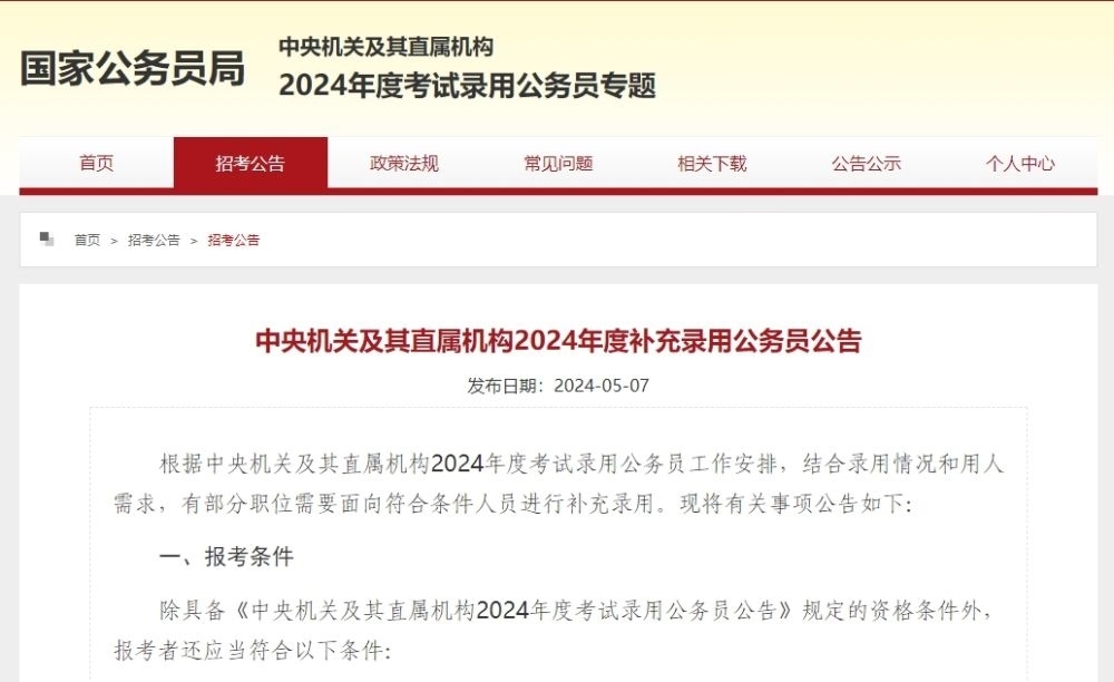 根據(jù)中央機關(guān)及其直屬機構(gòu)2024年度考試錄用公務員工作安排,結(jié)合錄用情況和用人需求,有部分職位需要面向符合條件人員進行補充錄用?,F(xiàn)將有關(guān)事項公告如下:
