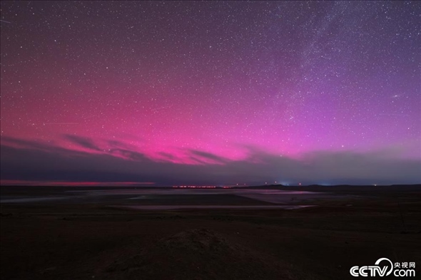 5月11日凌晨,隨著太陽(yáng)強(qiáng)耀斑的再次爆發(fā),內(nèi)蒙古錫林浩特市上空出現(xiàn)絢麗的洋紅色極光。
