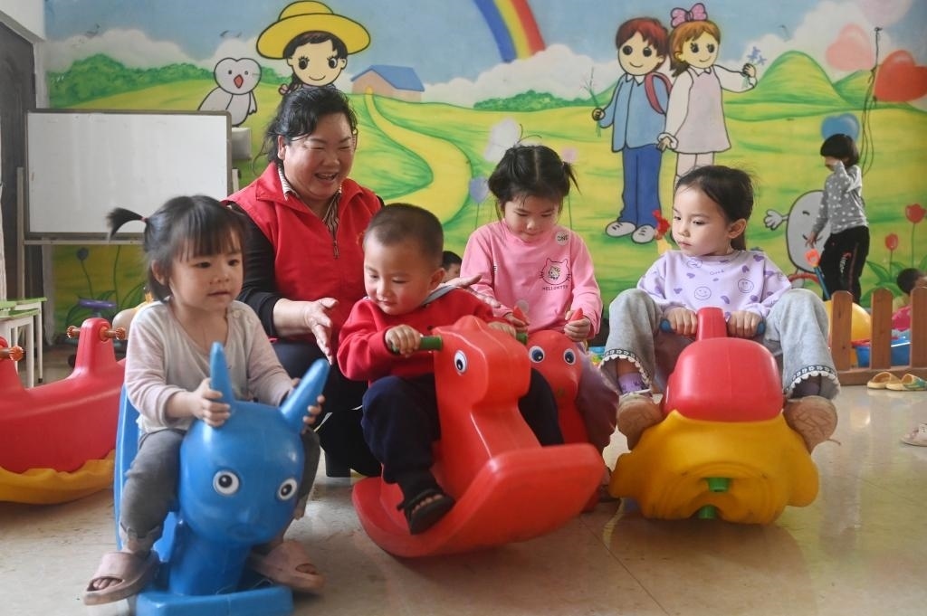?↑在廣西賓陽縣中華鎮(zhèn)的一個(gè)“留守兒童之家”,張清秀和孩子們一起玩耍(2024年3月5日攝)。