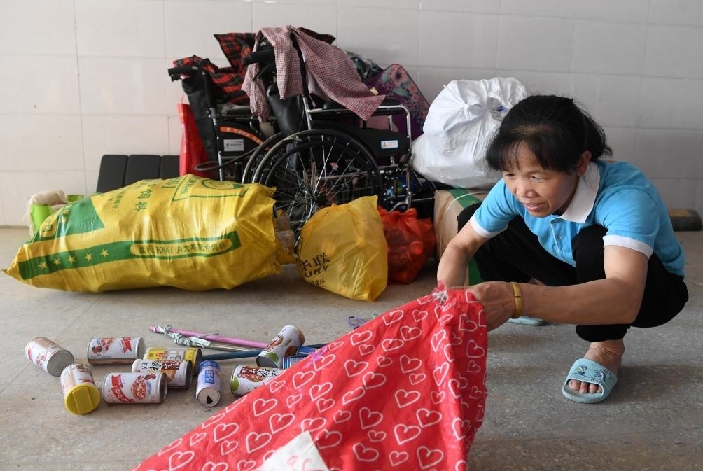 ?↑在廣西東蘭縣高級(jí)中學(xué),黃乜鮮在收拾撿回來的廢舊物品(2020年5月9日攝)。