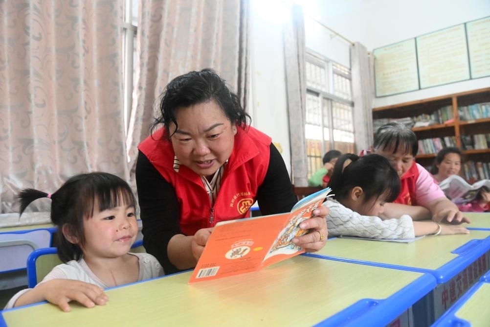 ?↑在廣西賓陽縣中華鎮(zhèn)的一個(gè)“留守兒童之家”,張清秀(左二)陪小朋友閱讀(2024年3月5日攝)。