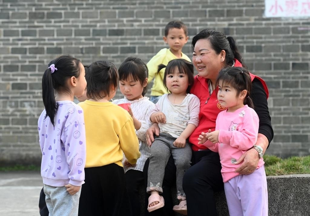 ?↑在廣西賓陽縣中華鎮(zhèn)的一個(gè)“留守兒童之家”活動(dòng)室外,張清秀和孩子們交流(2024年3月5日攝)。