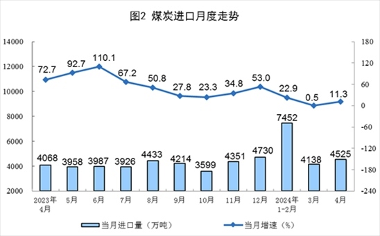 原煤生產(chǎn)降幅收窄,進(jìn)口明顯回升。4月份,規(guī)上工業(yè)原煤產(chǎn)量3.7億噸,同比下降2.9%,降幅比3月份收窄1.3個(gè)百分點(diǎn);日均產(chǎn)量1239萬噸。進(jìn)口煤炭4525萬噸,同比增長11.3%。