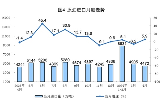 原油生產(chǎn)平穩(wěn)增長,進(jìn)口由降轉(zhuǎn)增。4月份,規(guī)上工業(yè)原油產(chǎn)量1747萬噸,同比增長1.3%,增速比3月份加快0.1個(gè)百分點(diǎn);日均產(chǎn)量58.2萬噸。進(jìn)口原油4472萬噸,同比增長5.9%。