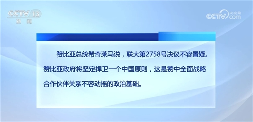 贊比亞總統(tǒng)希奇萊馬說,聯(lián)大第2758號決議不容置疑。贊比亞政府將堅定捍衛(wèi)一個中國原則,這是贊中全面戰(zhàn)略合作伙伴關(guān)系不容動搖的政治基礎(chǔ)。