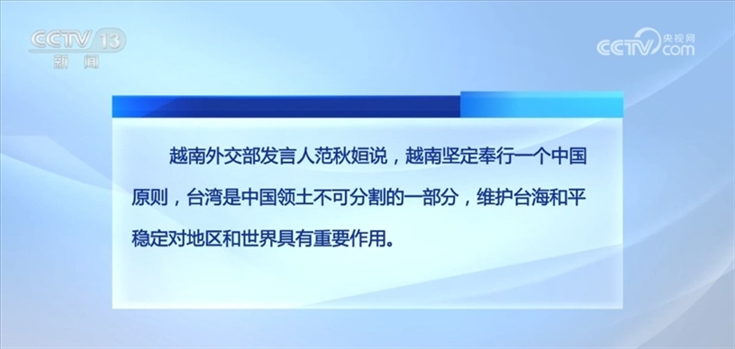越南外交部發(fā)言人范秋姮說,越南堅定奉行一個中國原則,臺灣是中國領(lǐng)土不可分割的一部分,維護臺海和平穩(wěn)定對地區(qū)和世界具有重要作用。