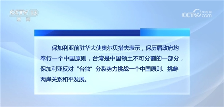 保加利亞前駐華大使奧爾貝措夫表示,保歷屆政府均奉行一個中國原則,臺灣是中國領(lǐng)土不可分割的一部分,保加利亞反對“臺獨”分裂勢力挑戰(zhàn)一個中國原則、挑釁兩岸關(guān)系和平發(fā)展。