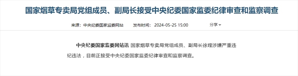 國家煙草專賣局黨組成員、副局長接受中央紀(jì)委國家監(jiān)委紀(jì)律審查和監(jiān)察調(diào)查