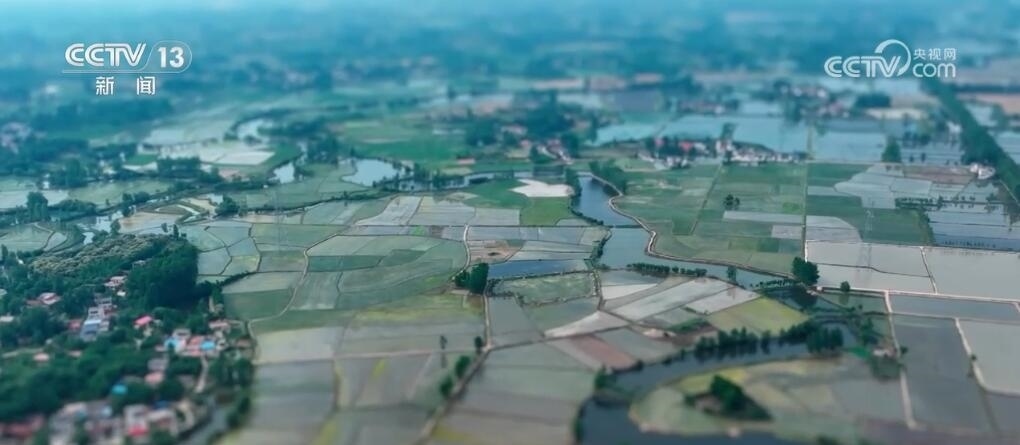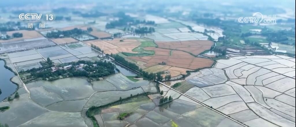 現(xiàn)在您看到的是河南信陽淮河以南的水稻插秧現(xiàn)場(chǎng)。插秧機(jī)在田間穿梭,一株株茁壯的秧苗被整齊有序地植入田間,一會(huì)兒工夫就插滿了整塊稻田??罩懈╊?,一臺(tái)臺(tái)插秧機(jī)在農(nóng)機(jī)手的操控下好似一把把畫刷,在稻田上輕輕暈染,繪就丹青。而同在信陽,淮河以北的麥田里,則是金色的麥浪翻滾起伏,收割機(jī)馳騁田間,飽滿的麥穗被卷入機(jī)艙,經(jīng)過收割、脫粒,顆粒歸倉。