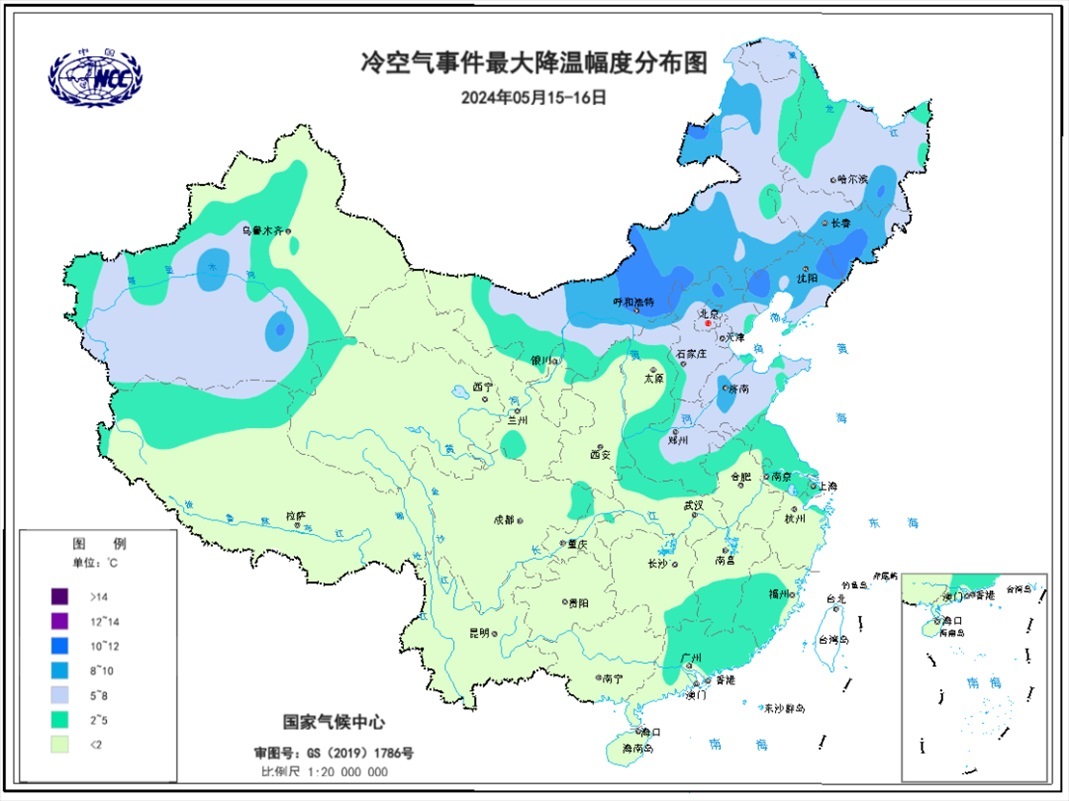 圖8 2024年5月15-16日全國(guó)最大降溫幅度分布圖