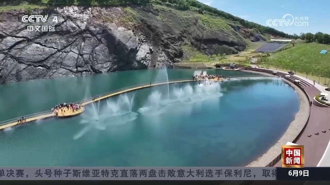 在黑龍江雙鴨山的翡翠湖礦坑公園,藍(lán)綠色湖水在陽(yáng)光照耀下如詩(shī)如畫(huà),游客們身處山野間,感受著自然之美和夏日清涼。