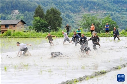 重慶市酉陽土家族苗族自治縣花田鄉(xiāng)何家?guī)r村的村民參加慶端午民俗活動(dòng)。