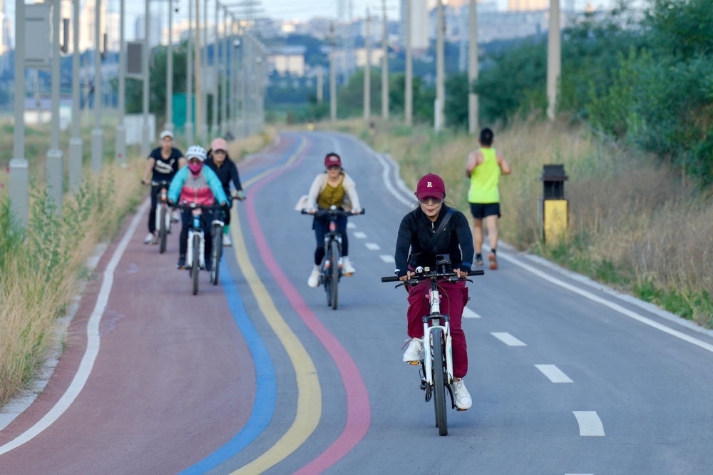 2024年6月5日,人們在運(yùn)城鹽湖環(huán)湖步道上騎行。