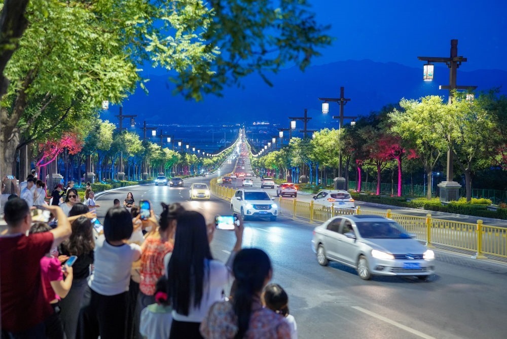 2024年5月21日,游客在升級改造后的運(yùn)城市“鹽湖006號燈桿”觀景臺拍照。
