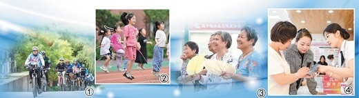 圖①:河北邯鄲市復(fù)興區(qū)沁河源景區(qū),騎行愛(ài)好者在騎行。聶長(zhǎng)青攝 圖②:河南洛陽(yáng)市瀍河回族區(qū)君河灣小學(xué),暑期托管班的學(xué)生在跳繩。李衛(wèi)超攝 圖③:安徽合肥市蜀山區(qū)小廟鎮(zhèn)五十墩社區(qū)文化廣場(chǎng),村民在看戲曲演出。陳三虎攝 圖④:內(nèi)蒙古鄂爾多斯市康巴什區(qū)寧馨社區(qū)政務(wù)便民服務(wù)站,工作人員幫居民辦業(yè)務(wù)。王 正攝