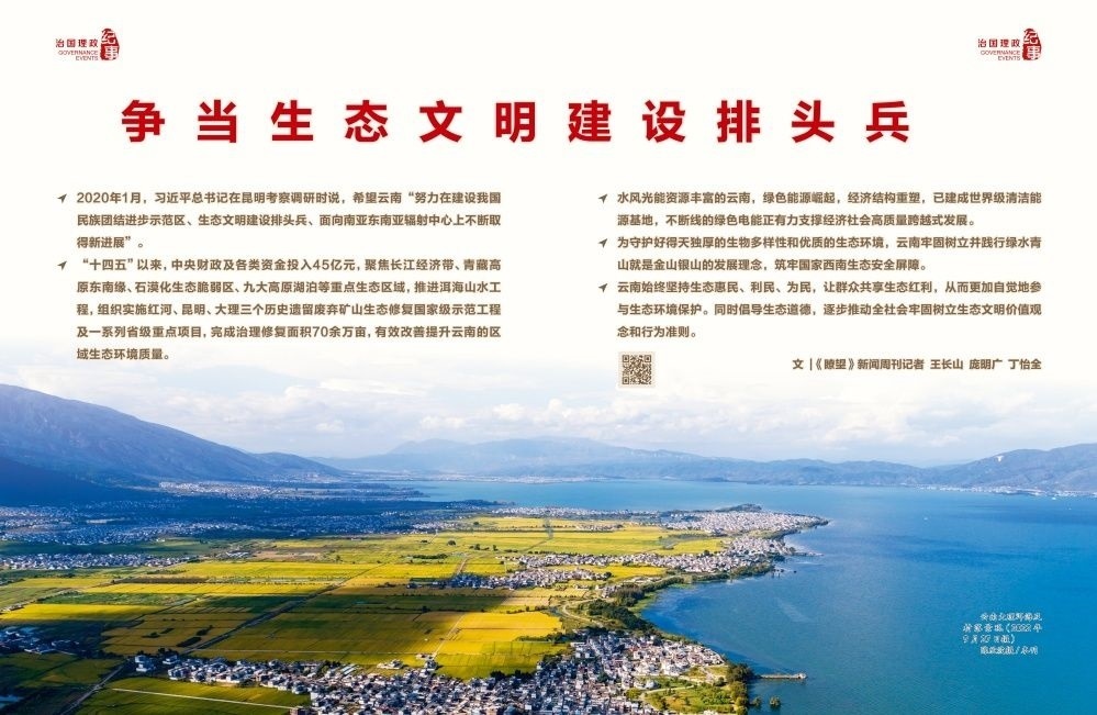 云南切實(shí)把生態(tài)文明建設(shè)擺在全局工作的突出位置,全面加強(qiáng)生態(tài)文明建設(shè),開啟美麗云南建設(shè)新征程。2022年5月,《云南省生態(tài)文明建設(shè)排頭兵規(guī)劃(2021—2025年)》發(fā)布,明確爭當(dāng)全國生態(tài)文明建設(shè)排頭兵目標(biāo)、主要任務(wù)和重大舉措,切實(shí)提升生態(tài)環(huán)境治理體系和治理能力現(xiàn)代化水平,全面形成綠色發(fā)展方式和生活方式。