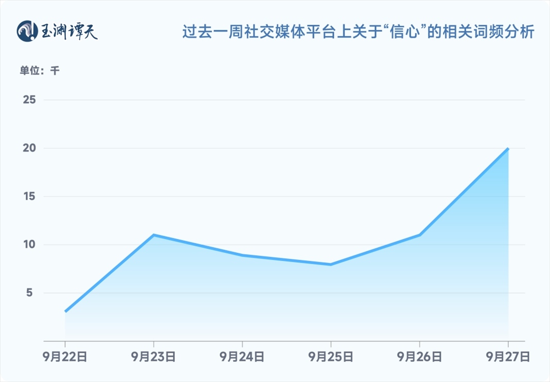 從這張曲線圖上可以看到,輿論場(chǎng)對(duì)“中國(guó)經(jīng)濟(jì)”的討論,在過(guò)去一周經(jīng)歷了2個(gè)峰值。其中,“信心”這個(gè)詞出現(xiàn)的頻率經(jīng)歷了兩次躍升。
