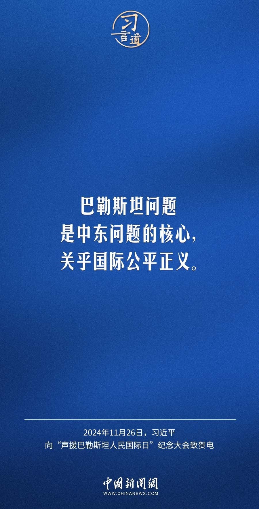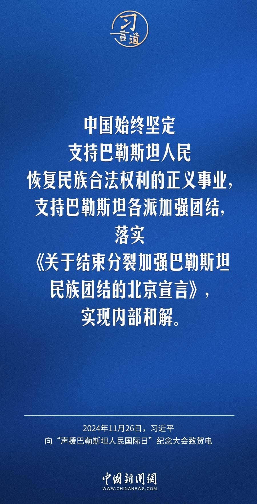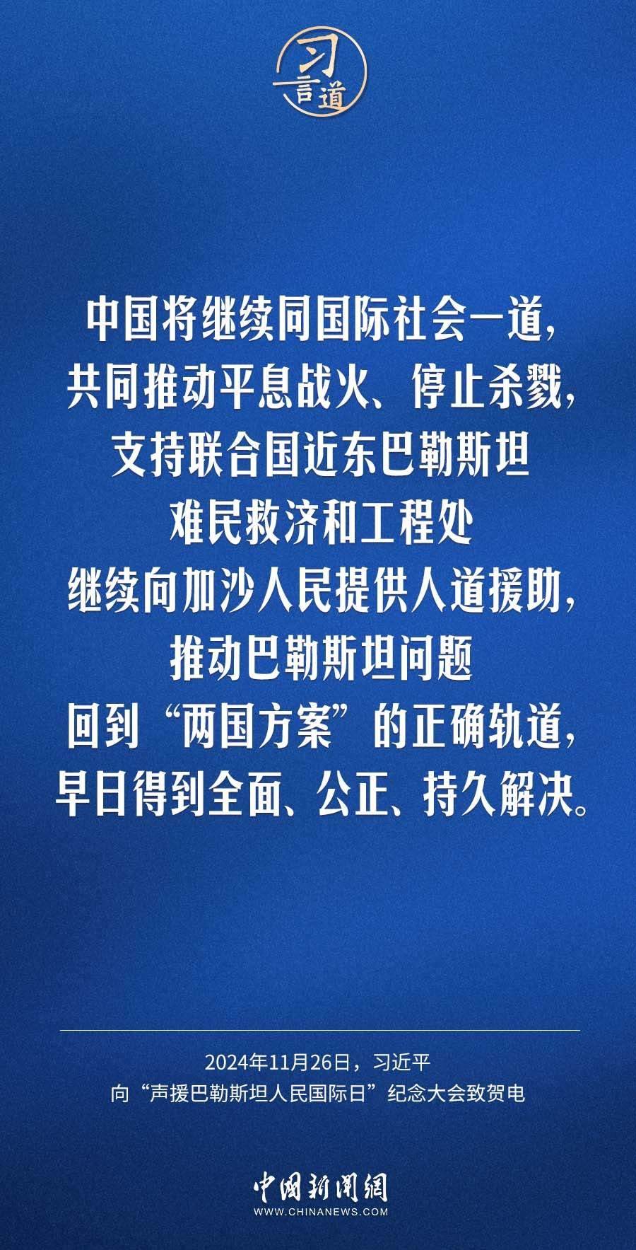 11月26日,聯(lián)合國(guó)舉行“聲援巴勒斯坦人民國(guó)際日”紀(jì)念大會(huì),國(guó)家主席習(xí)近平向大會(huì)致賀電。習(xí)近平指出——