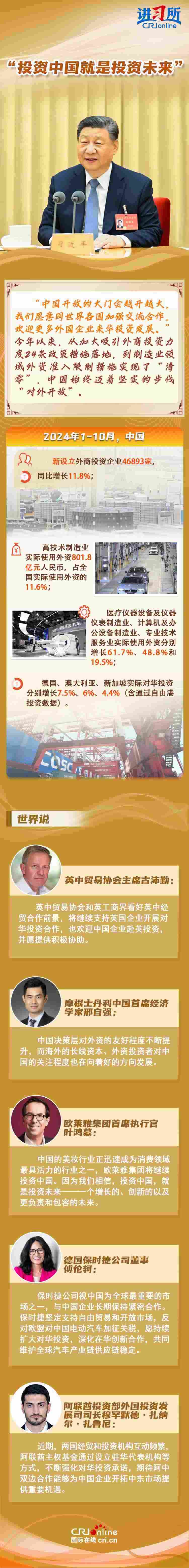 “中國是實(shí)干家、行動派。”今年以來,從習(xí)近平主席的歐洲之行到拉美之行,再到四天前在北京會見主要國際經(jīng)濟(jì)組織負(fù)責(zé)人,習(xí)近平一直強(qiáng)調(diào),中國的發(fā)展將給世界帶來巨大機(jī)遇。據(jù)聯(lián)合國貿(mào)易和發(fā)展會議不久前發(fā)布的《世界投資報告2024》中文版顯示,中國吸引外資的結(jié)構(gòu)不斷優(yōu)化、質(zhì)量不斷提高,多位政商界人士也認(rèn)為中國是一個非常有前景的市場,投資中國就是投資未來。