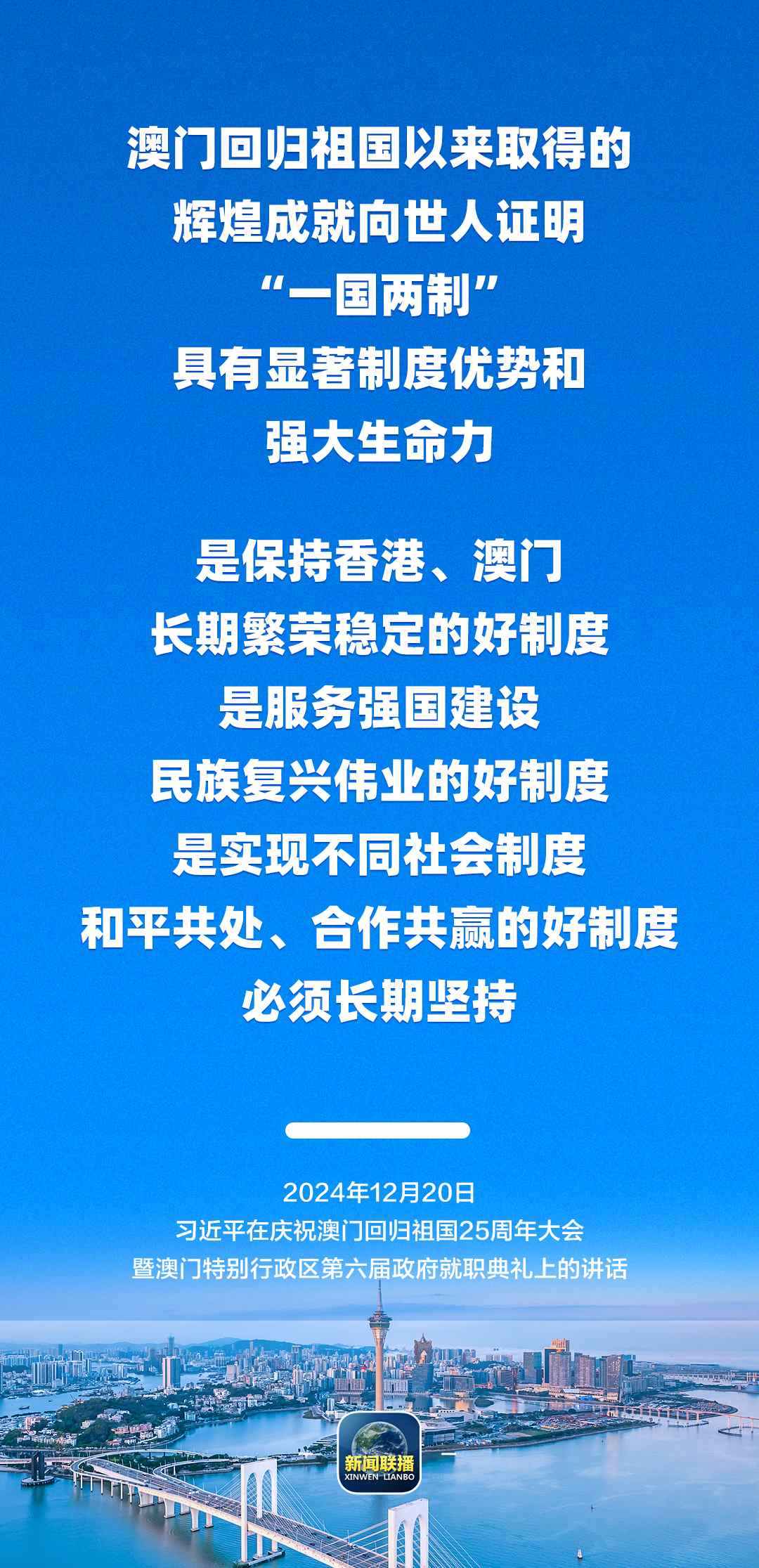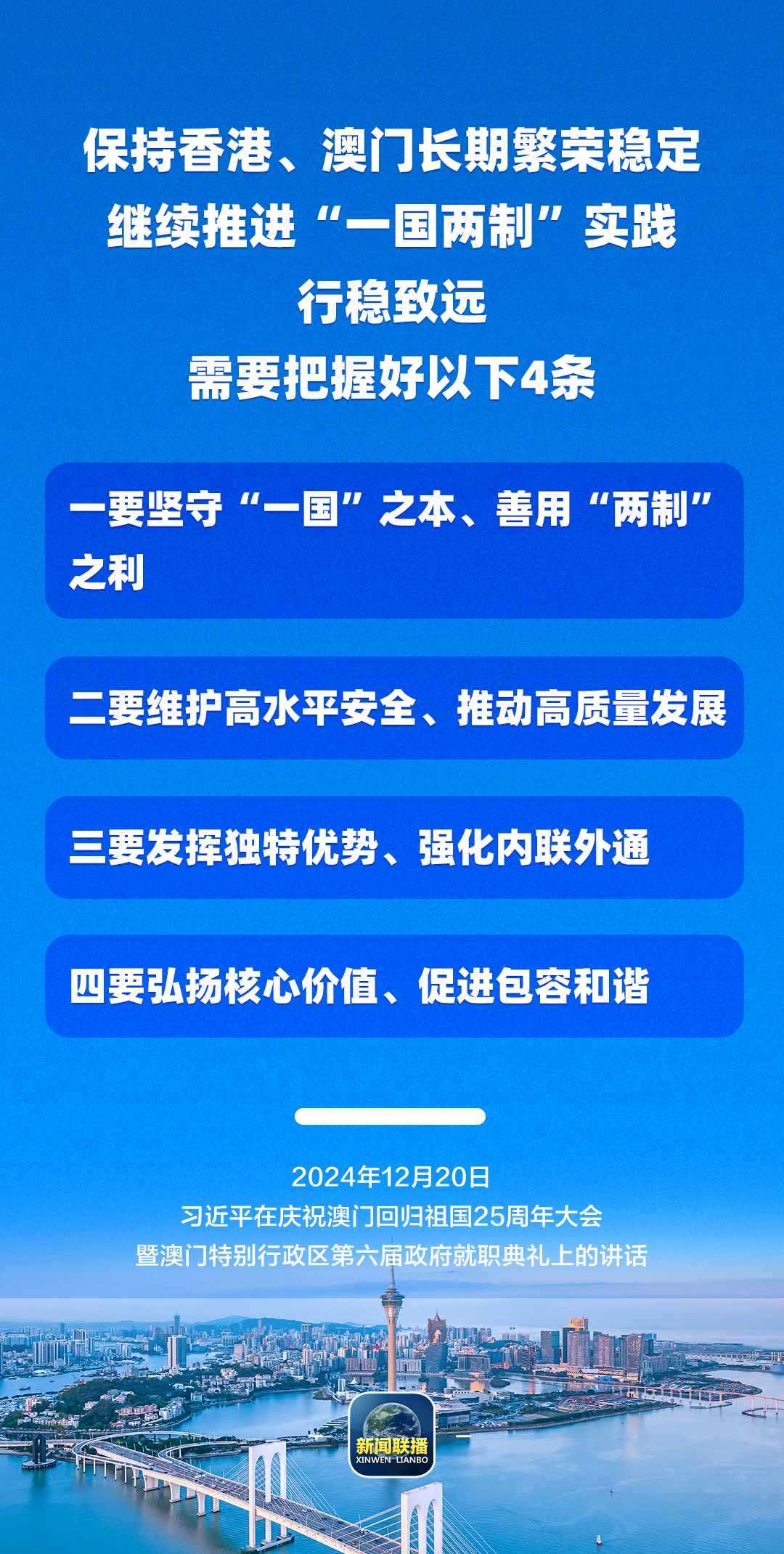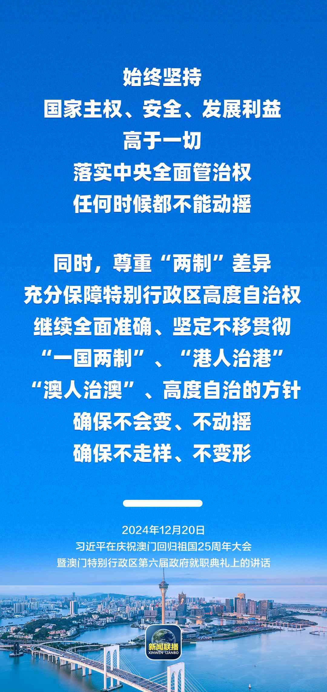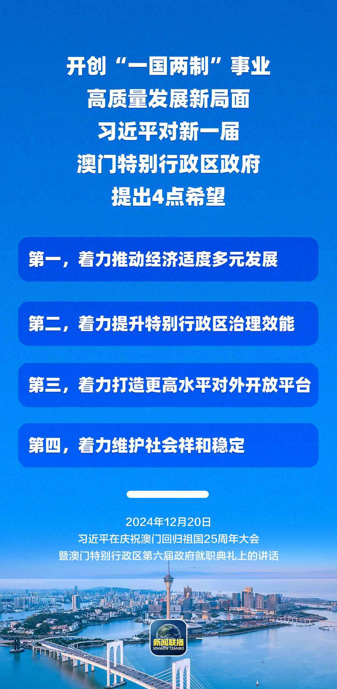 習(xí)近平強(qiáng)調(diào),只要全面準(zhǔn)確、堅(jiān)定不移貫徹“一國(guó)兩制”方針,有特別行政區(qū)政府和社會(huì)各界共同努力,有偉大祖國(guó)作堅(jiān)強(qiáng)后盾,澳門(mén)一定能打開(kāi)發(fā)展新天地、不斷創(chuàng)造新輝煌,一定能為以中國(guó)式現(xiàn)代化全面推進(jìn)強(qiáng)國(guó)建設(shè)、民族復(fù)興偉業(yè)作出更大貢獻(xiàn)。