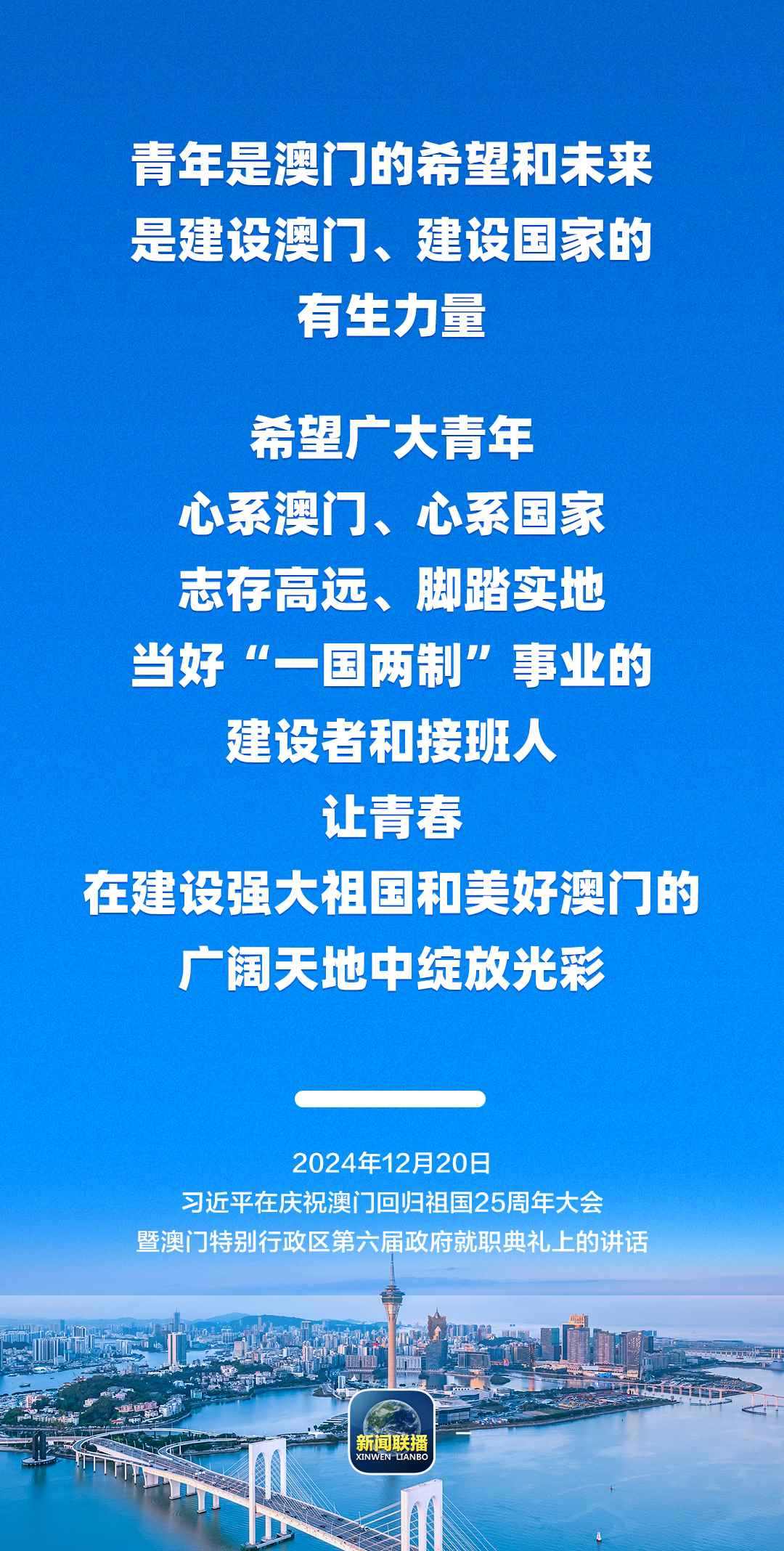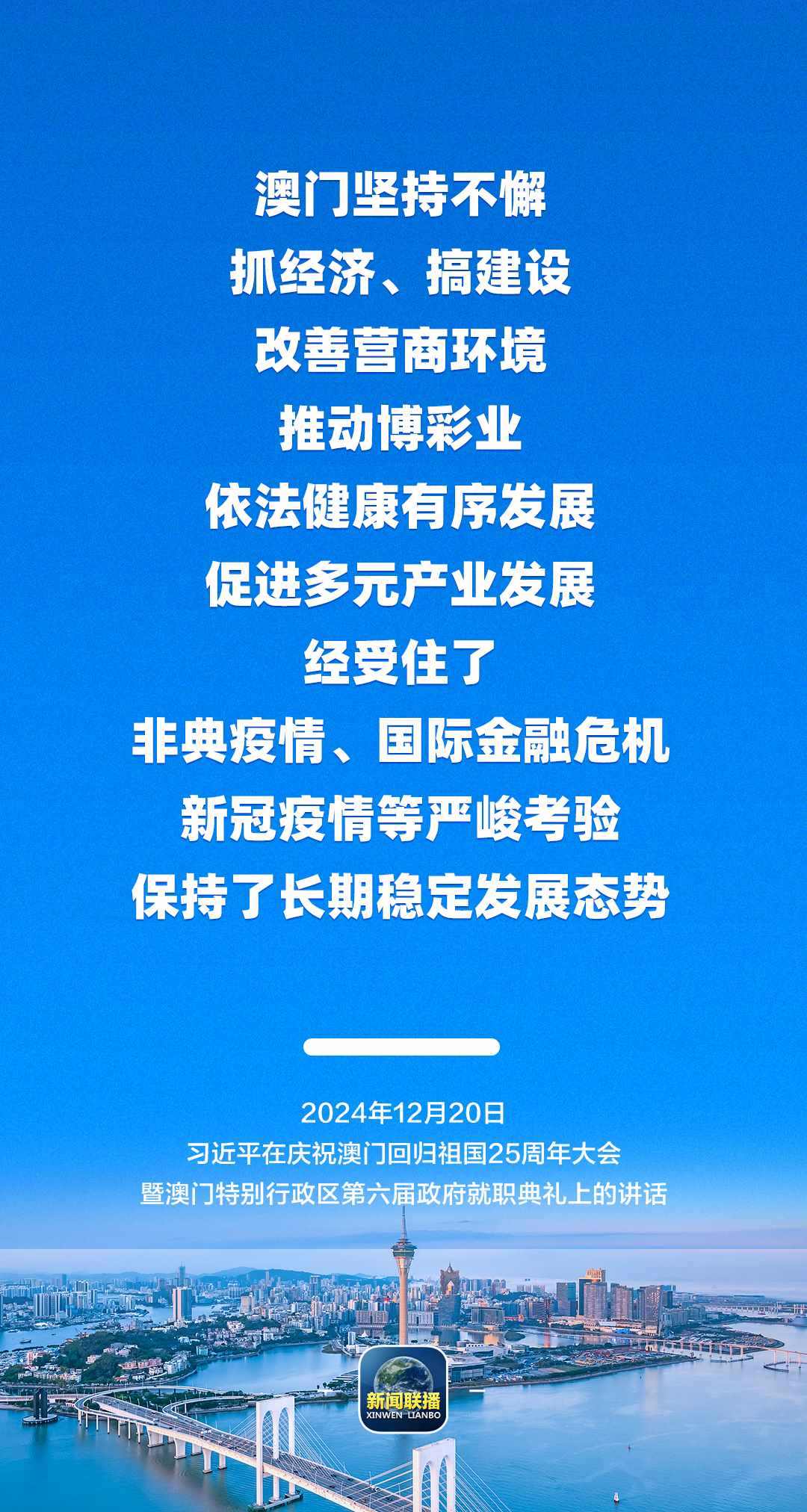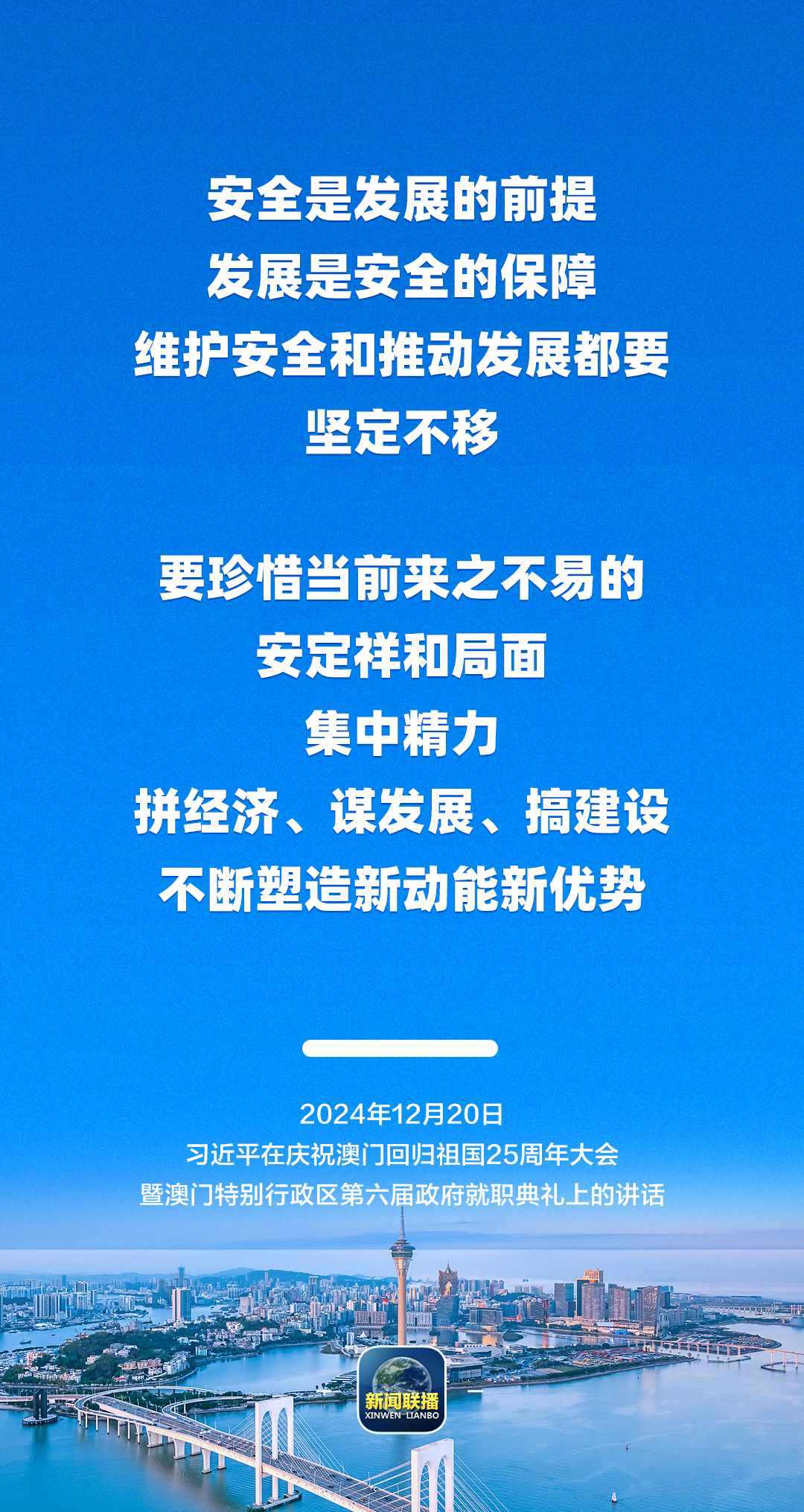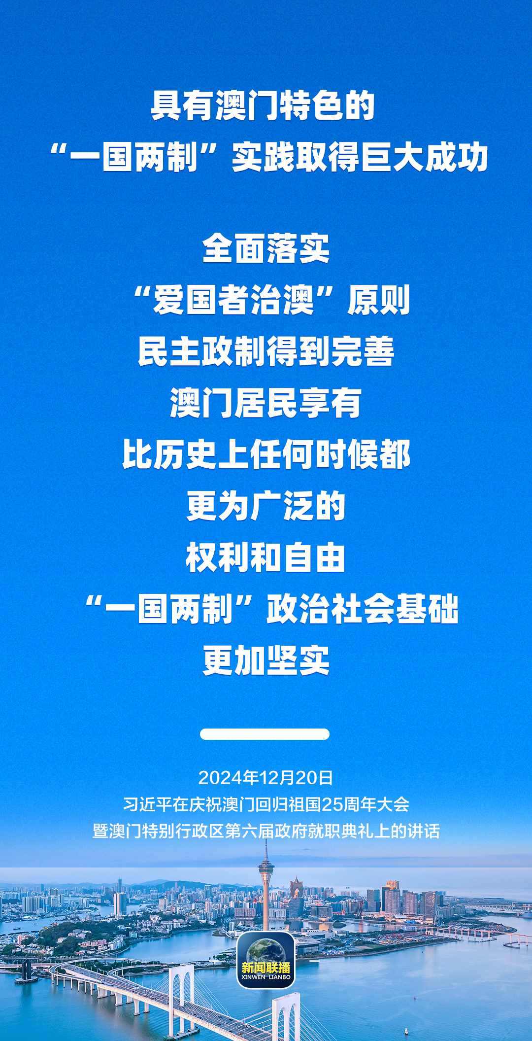 習(xí)近平強(qiáng)調(diào),只要全面準(zhǔn)確、堅(jiān)定不移貫徹“一國(guó)兩制”方針,有特別行政區(qū)政府和社會(huì)各界共同努力,有偉大祖國(guó)作堅(jiān)強(qiáng)后盾,澳門(mén)一定能打開(kāi)發(fā)展新天地、不斷創(chuàng)造新輝煌,一定能為以中國(guó)式現(xiàn)代化全面推進(jìn)強(qiáng)國(guó)建設(shè)、民族復(fù)興偉業(yè)作出更大貢獻(xiàn)。