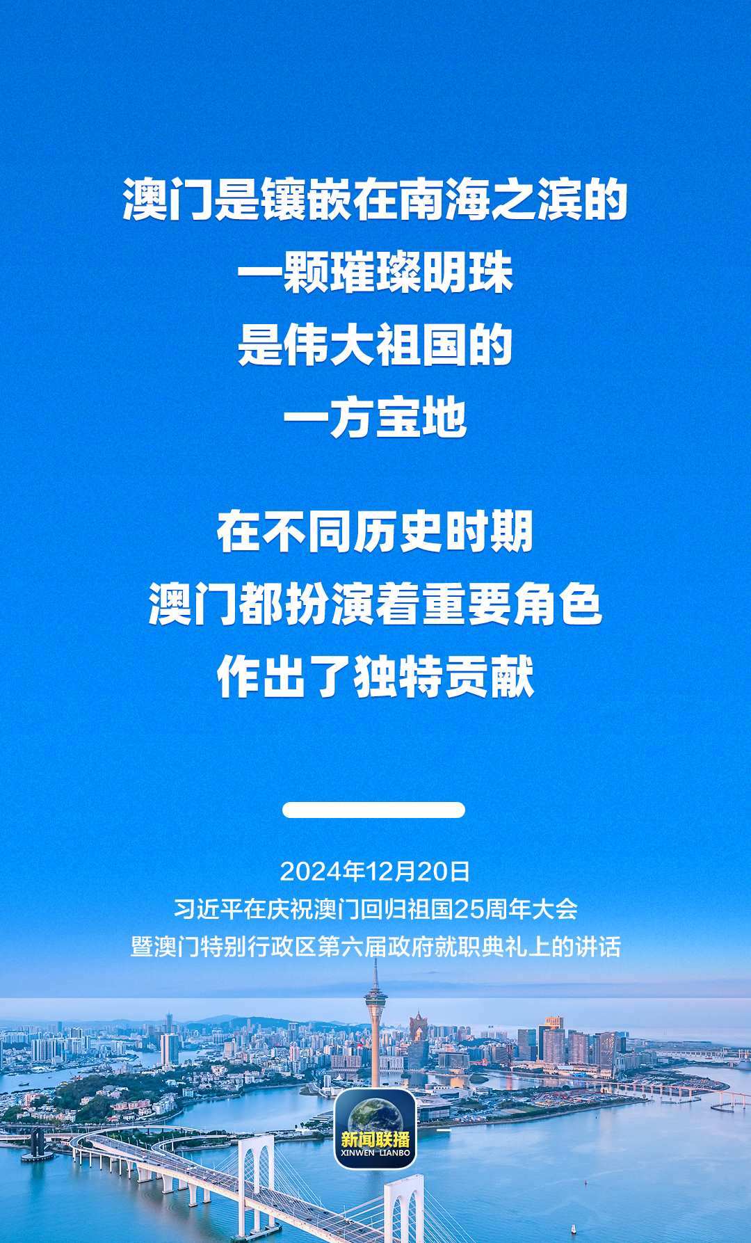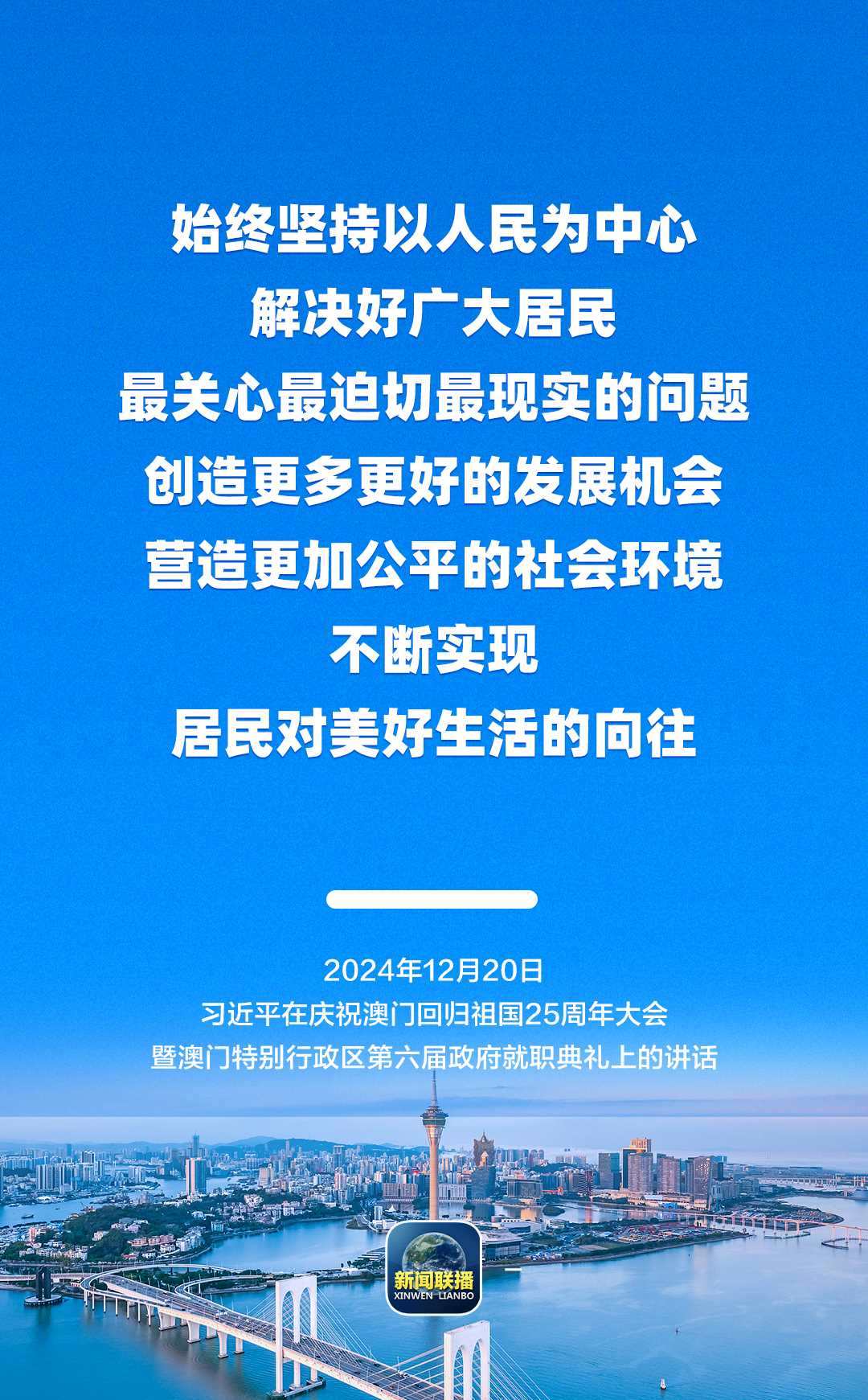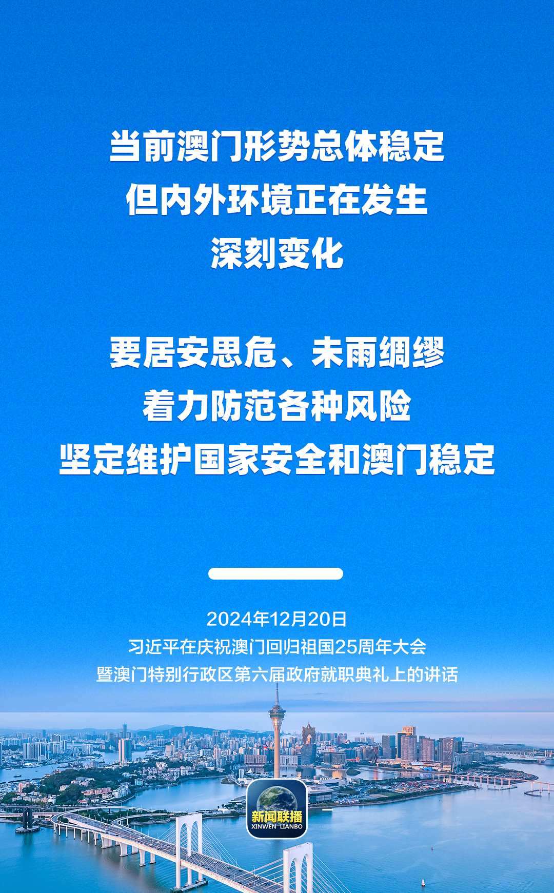 12月20日上午,慶祝澳門(mén)回歸祖國(guó)25周年大會(huì)暨澳門(mén)特別行政區(qū)第六屆政府就職典禮舉行。中共中央總書(shū)記、國(guó)家主席、中央軍委主席習(xí)近平出席并發(fā)表重要講話(huà)。
