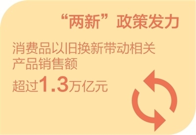 商務(wù)部新聞發(fā)言人何詠前:中央經(jīng)濟(jì)工作會議提出,大力提振消費。初步統(tǒng)計,2024年,全國汽車以舊換新超過680萬輛,超3600萬名消費者購買8大類家電以舊換新產(chǎn)品超過5600萬臺,家裝廚衛(wèi)“煥新”補貼產(chǎn)品約6000萬件,電動自行車以舊換新超過138萬輛。消費品以舊換新帶動相關(guān)產(chǎn)品銷售額超過1.3萬億元。