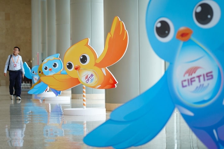 2024年9月11日在國家會議中心拍攝的服貿(mào)會吉祥物“福燕”形象。新華社記者 陳鐘昊 攝