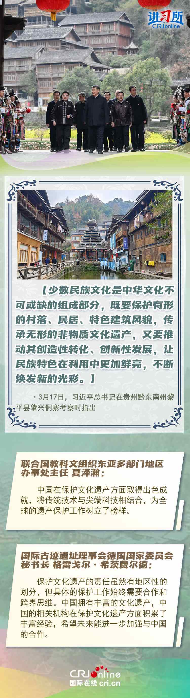 習(xí)近平總書記近日赴貴州、云南考察。他走進(jìn)民族特色村寨、歷史文化古城,心系歷史文化遺產(chǎn)保護(hù)和文旅融合發(fā)展。習(xí)近平特別叮囑當(dāng)?shù)毓賳T和群眾,既要保護(hù)有形的村落、民居、特色建筑風(fēng)貌,傳承無形的非物質(zhì)文化遺產(chǎn),又要推動其創(chuàng)造性轉(zhuǎn)化、創(chuàng)新性發(fā)展。