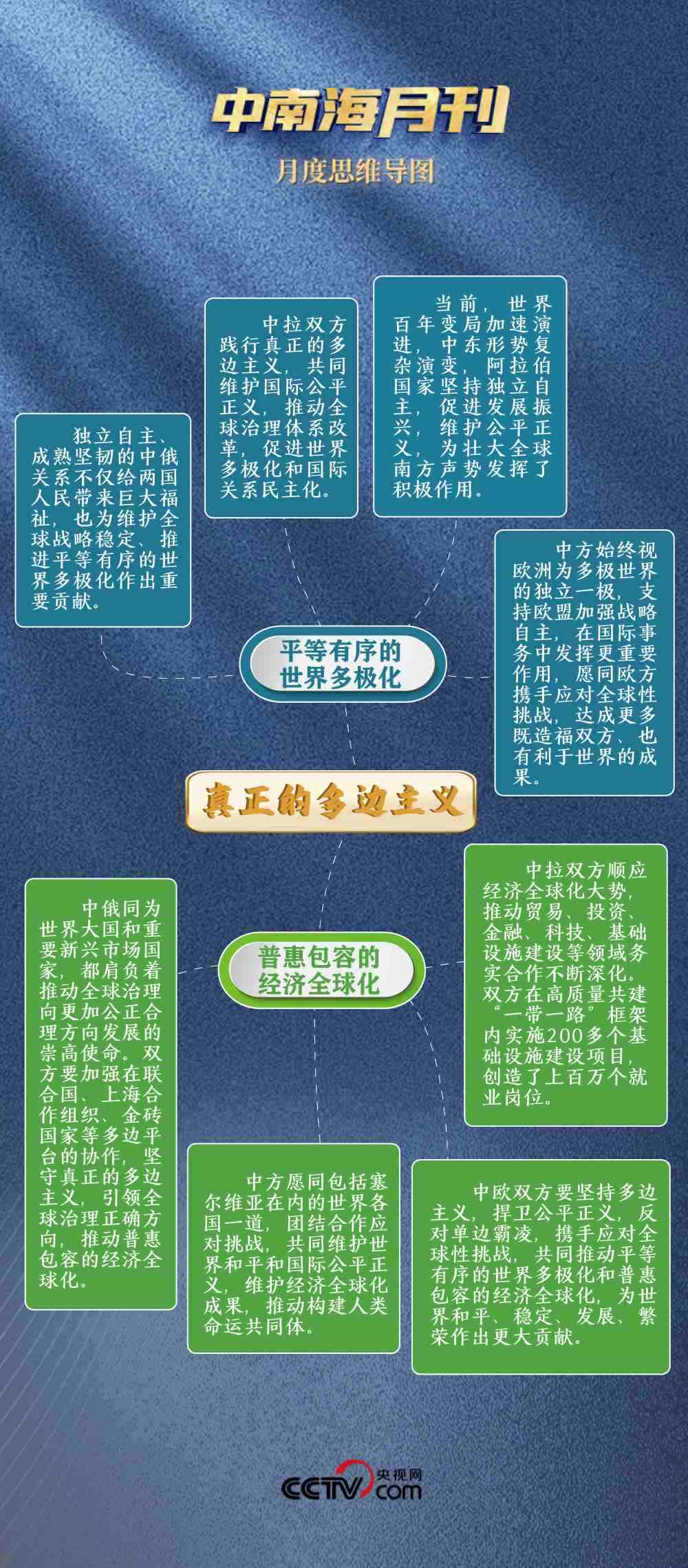 面對(duì)單邊主義逆流,堅(jiān)定不移推動(dòng)平等有序的世界多極化。不為一時(shí)一事所惑,不為風(fēng)高浪急所擾,與俄方達(dá)成“共同弘揚(yáng)正確二戰(zhàn)史觀,維護(hù)聯(lián)合國(guó)權(quán)威和地位,維護(hù)國(guó)際公平正義”的共識(shí);與歐盟“深化戰(zhàn)略溝通,增進(jìn)理解互信,鞏固伙伴定位”;同拉方攜手啟動(dòng)團(tuán)結(jié)、發(fā)展等五大工程,推動(dòng)中國(guó)同全球南方國(guó)家相互支持、團(tuán)結(jié)合作。