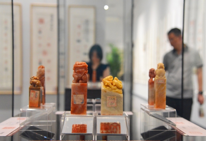 6月21日,觀眾在北京市海淀區(qū)三山五園文化藝術(shù)中心參觀薪傳國(guó)粹——“萬(wàn)印樓”新藏當(dāng)代國(guó)際篆刻精品展。