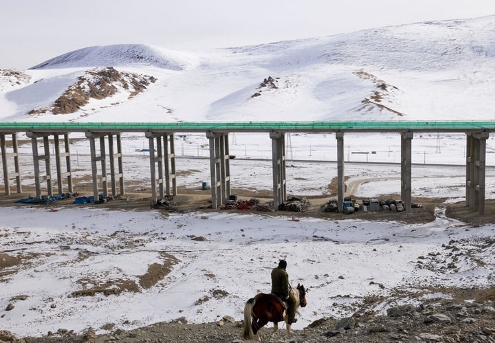 2024年12月30日,在新疆和靜縣,牧民騎馬從在建的新疆烏尉(烏魯木齊至尉犁)高速公路附近經過。新華社記者 王菲 攝