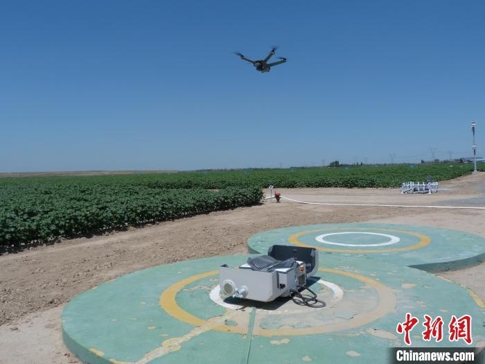 6月28日,新疆石河子市一片棉田中,遙感監(jiān)測(cè)作物長(zhǎng)勢(shì)的無(wú)人機(jī)巡檢返回?!≮w婧姝 攝